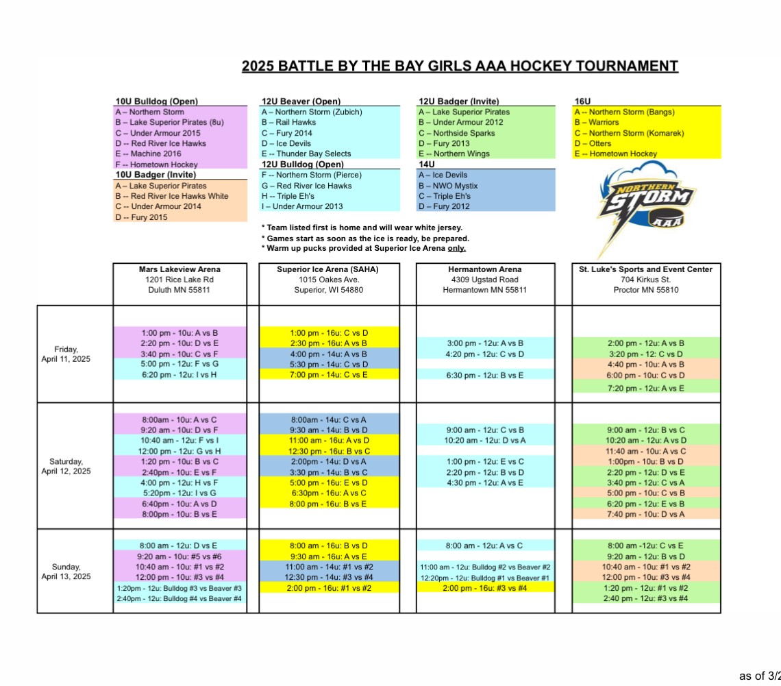 * Games at Proctor, Duluth Heritage, MARS Lakeview, Hermantown, Cloquet, Wessman and Superior, WI arenas